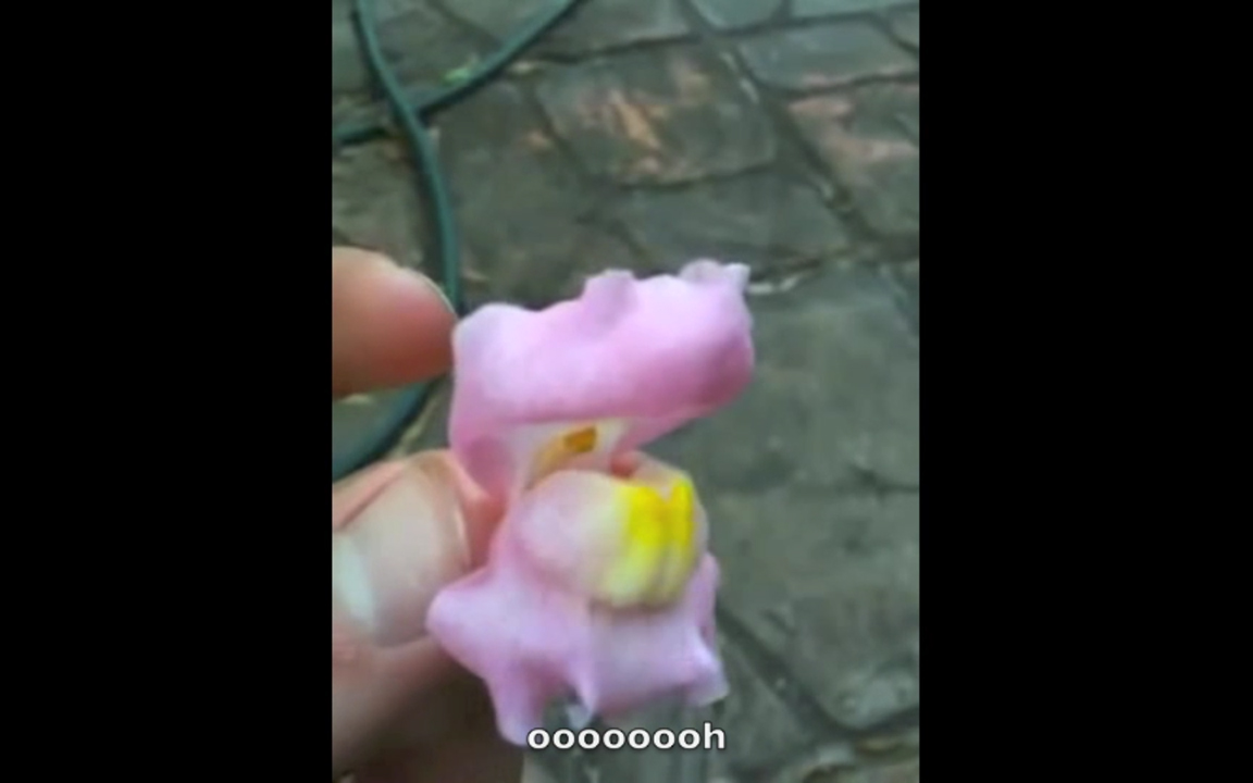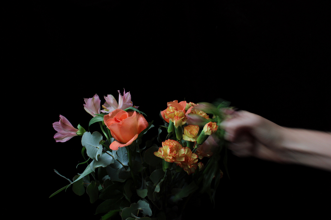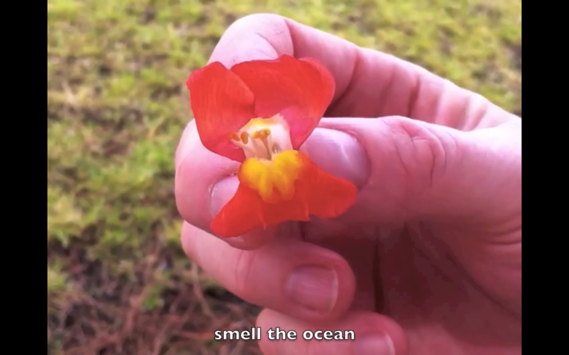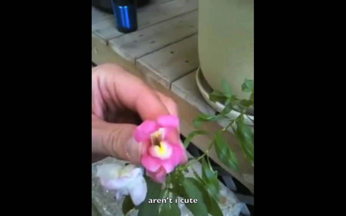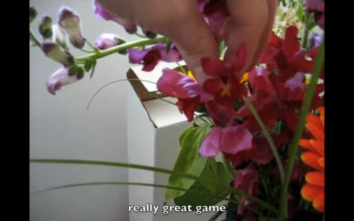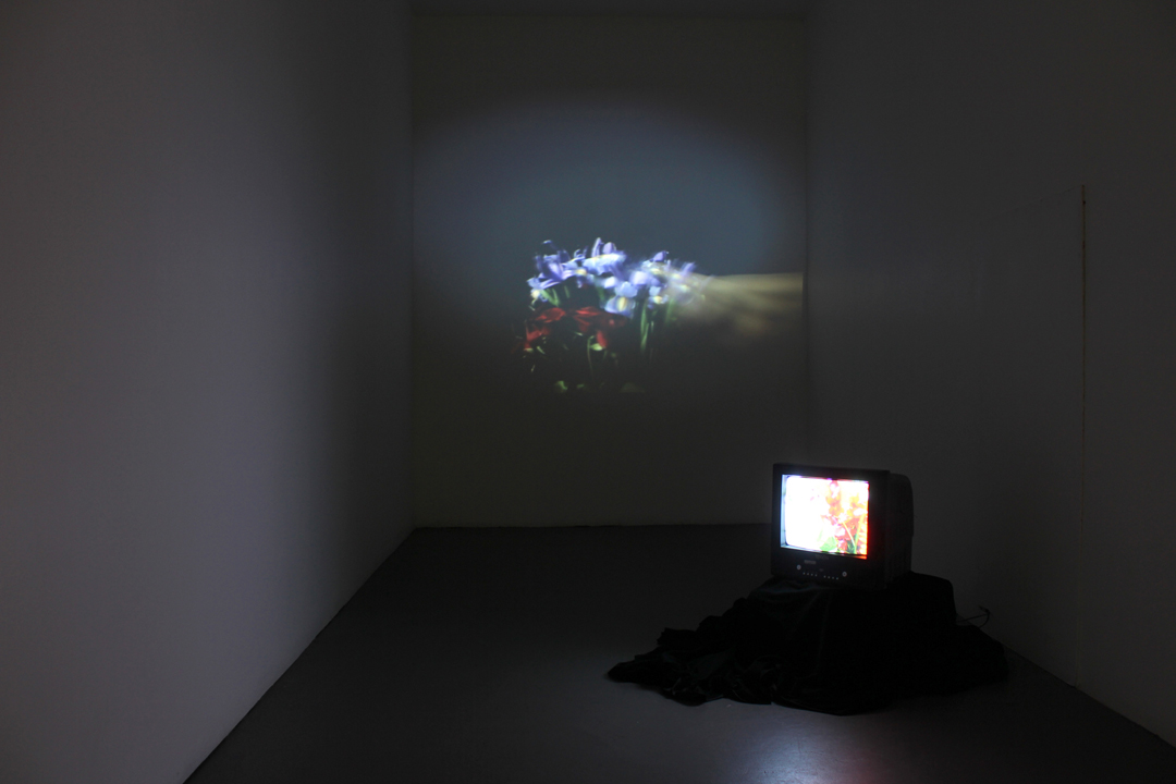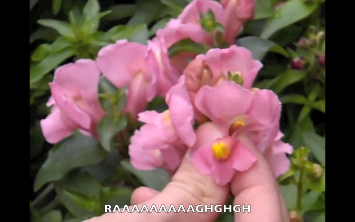 Still Life with Punches (2013) consists of two videos – a projection of floral arrangements being punched by a disembodied fist, and a captioned collection of found Youtube clips in which people make snapdragon flowers ‘talk’. Taking the still-life genre as a starting point, the installation creates a clumsy, slightly disturbing performance of human intervention into the ‘natural’ realm.