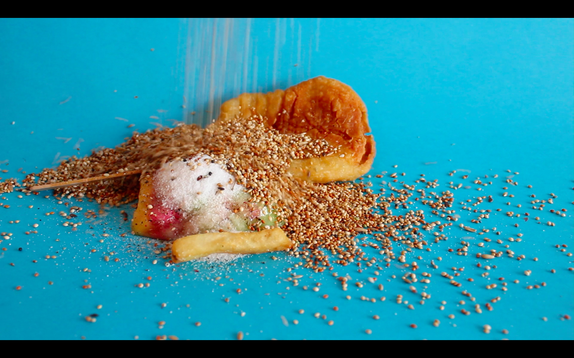 food advertisements for city birds - three channel video
