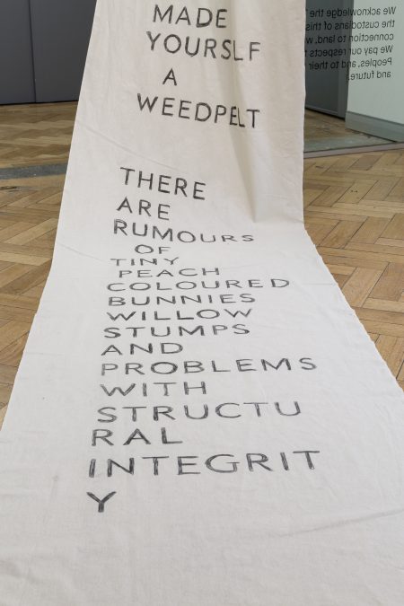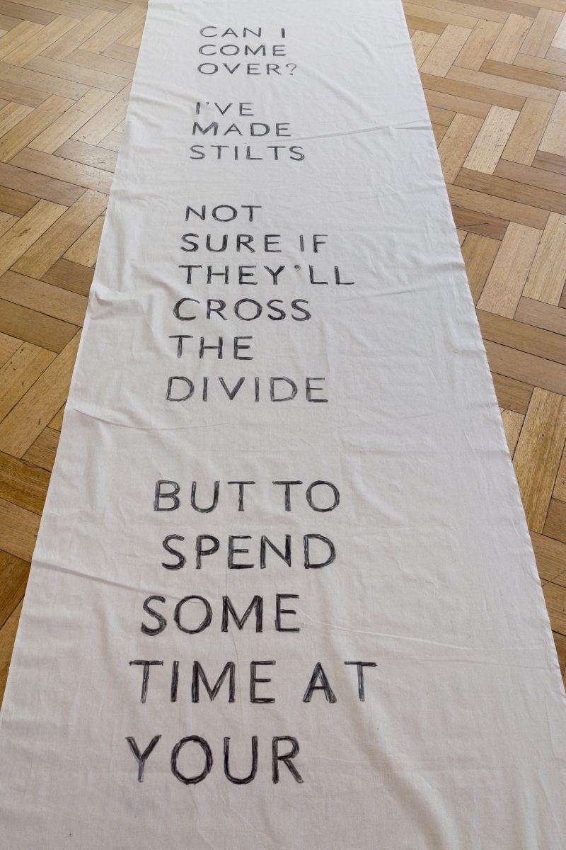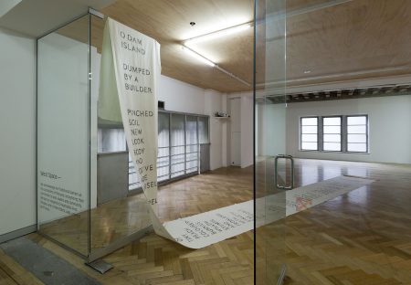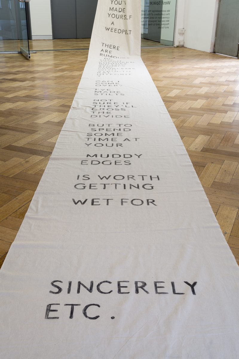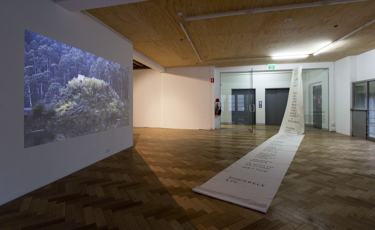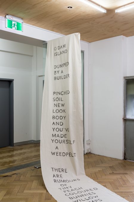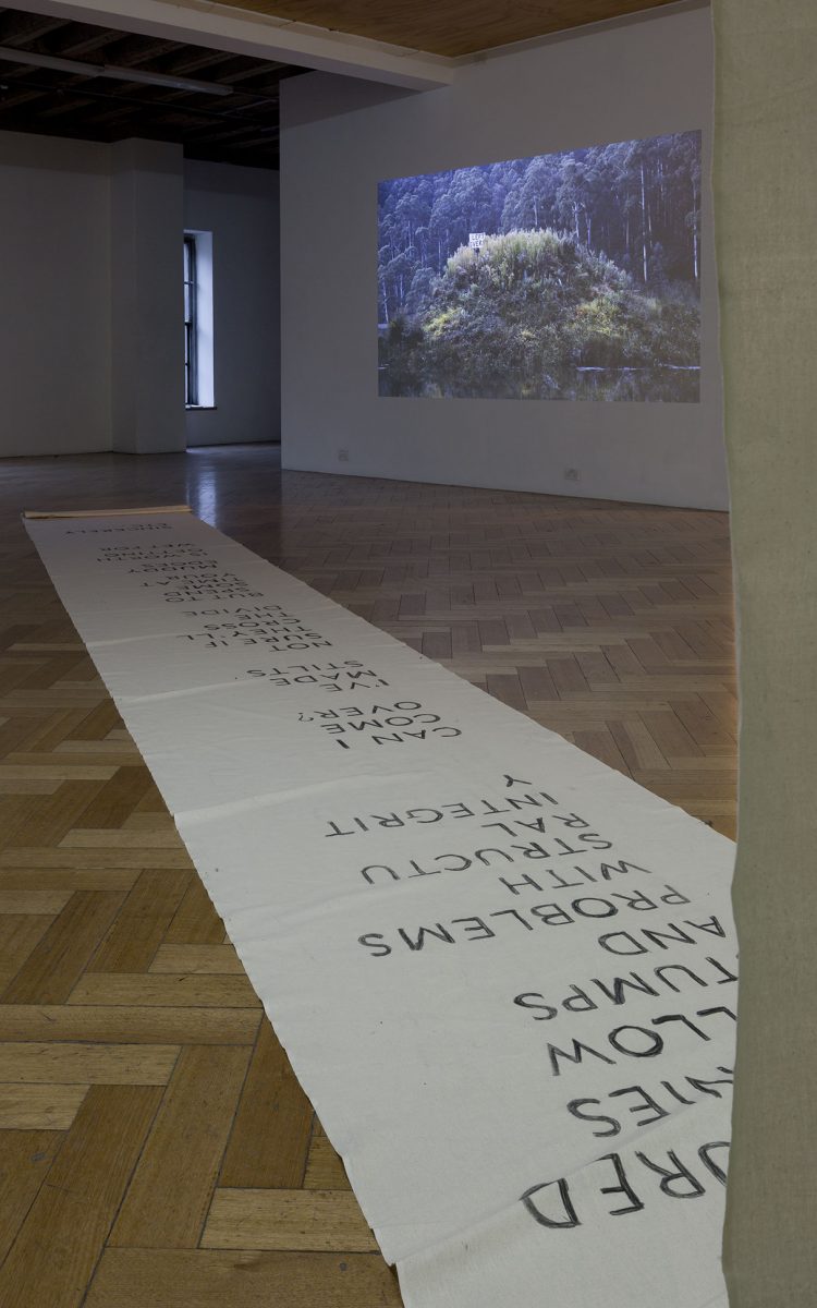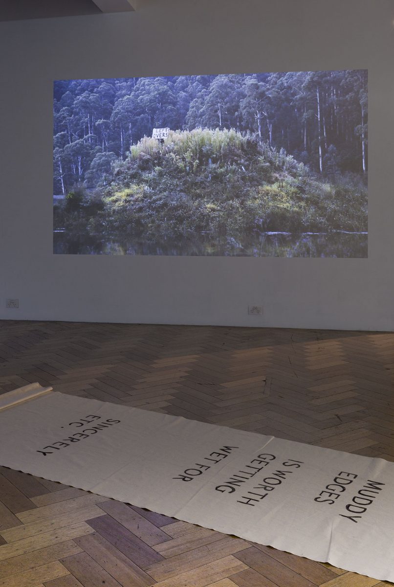 The Island: a conversation. Performance on a human-made island in a Mount Bogong dam (video) + letter to the island (banner). Image credit: Christo Crocker (2017)