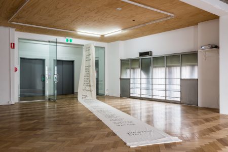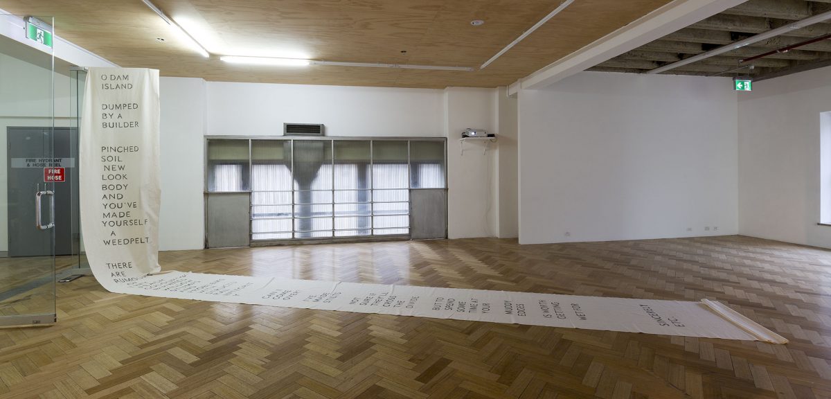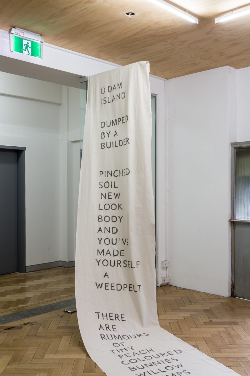 The Island: a conversation. Performance on a human-made island in a Mount Bogong dam (video) + letter to the island (banner). Image credit: Christian Capurro (2017)