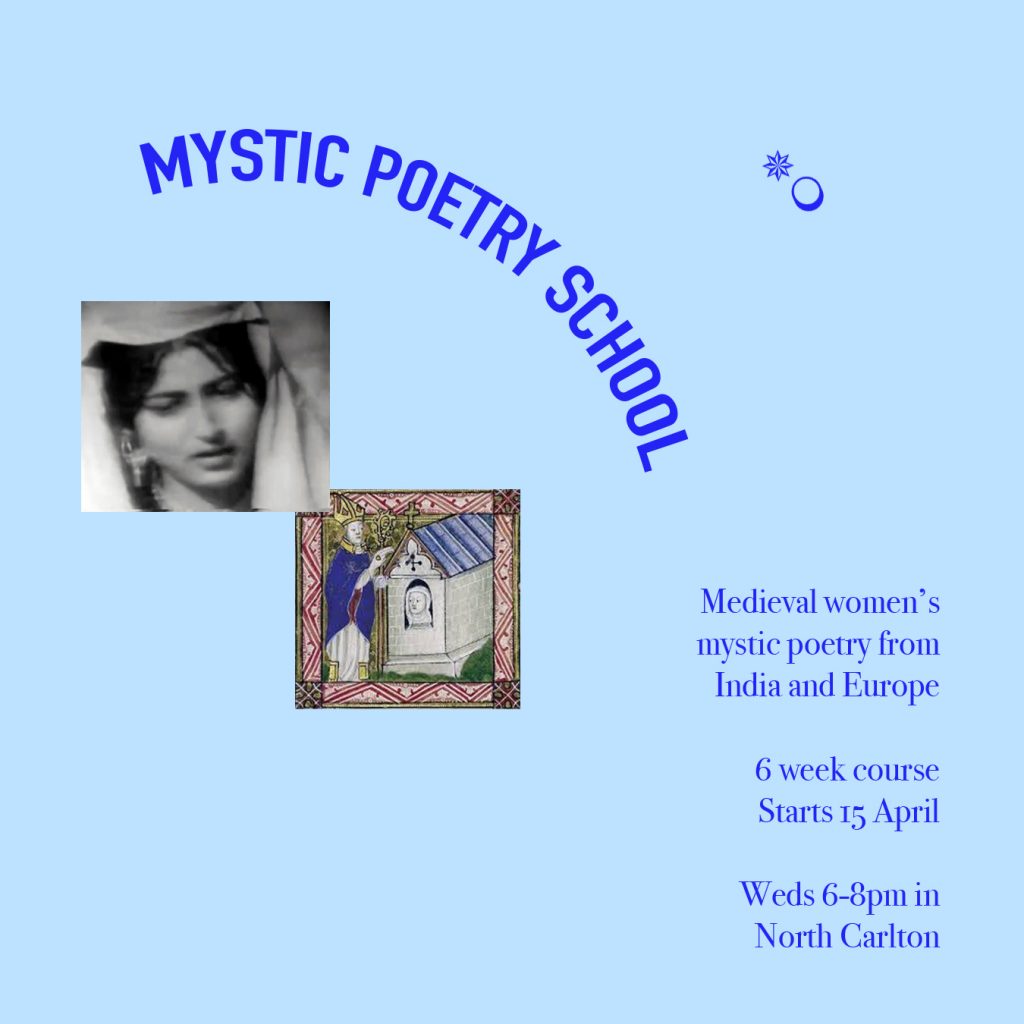 We ask: what can the lives and words of medieval women mystics invoke in a secular society? How can we expand on these ideas of renunciation, devotion and eroticism? What are practical skills and tools needed to approach poetry? What visions can we cultivate in a crumbling world?